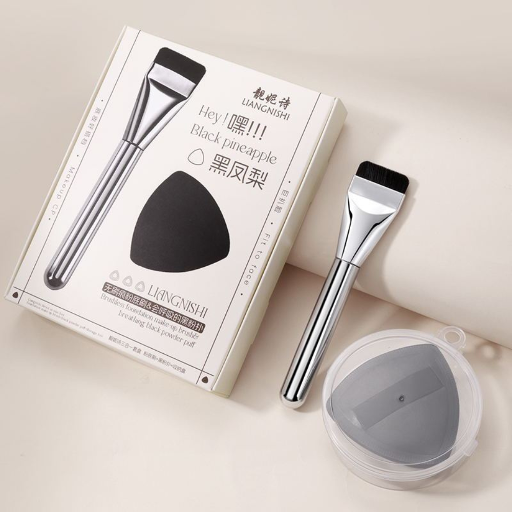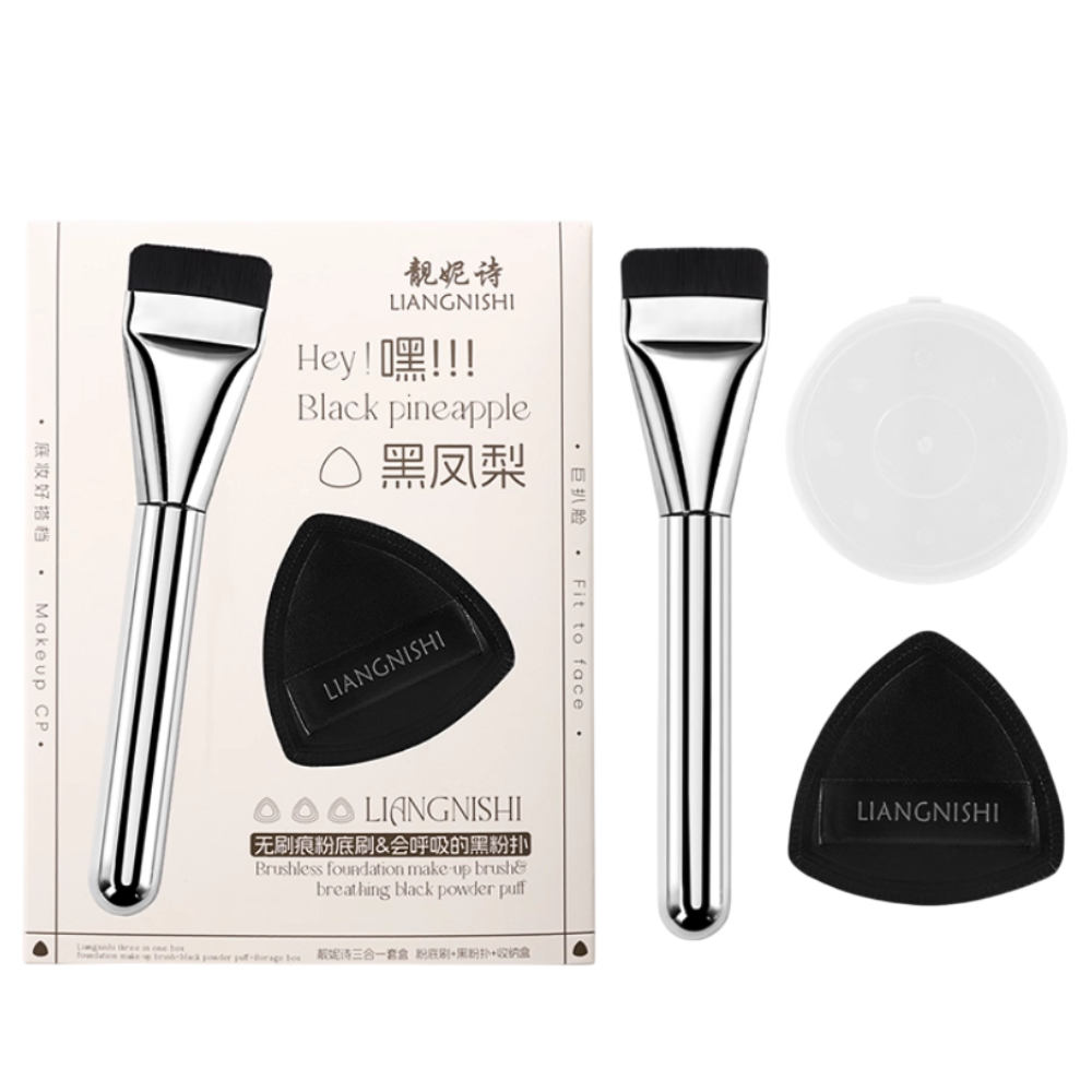LIANGNISHI Hey! Black Pineapple Makeup Brush & Puff 3 in 1 Box