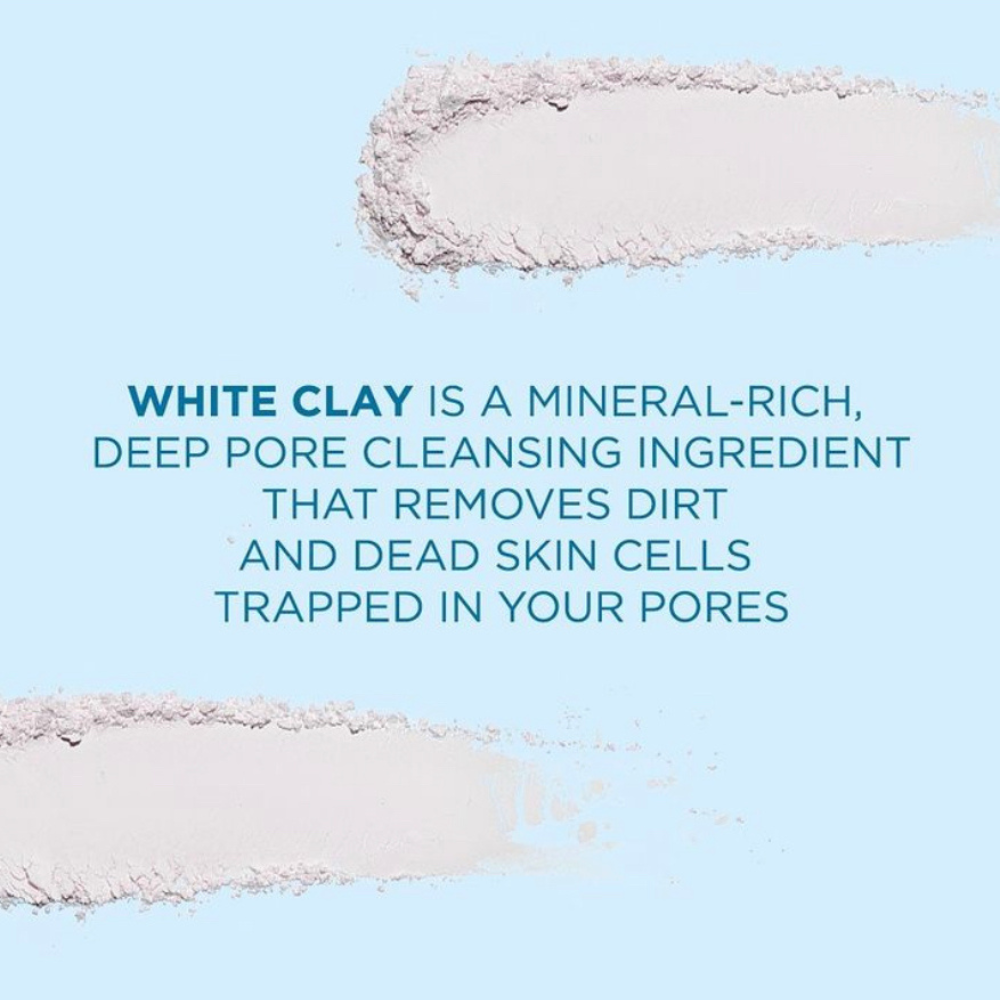 - Deep pore cleansing with white clay to remove dirt, blackheads, and impurities